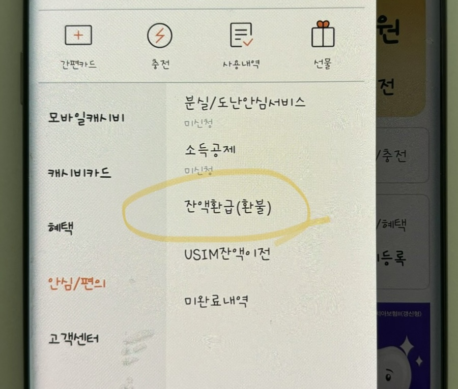 ①메뉴에서 안심/편의- 잔액 환급(환불) 선택